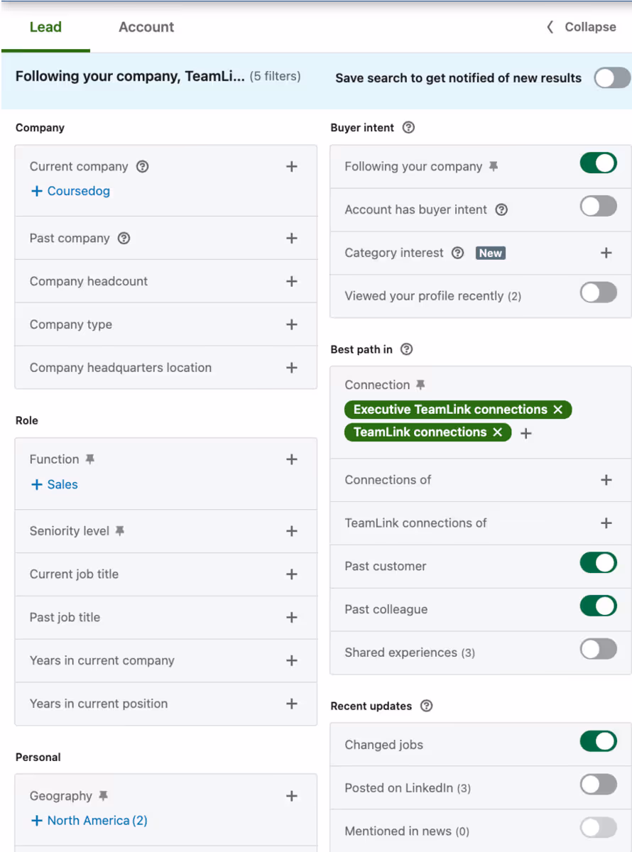 - Exec intros / TeamLink (allows you to see the connections of other people who work at your company if they have a Sales Nav license)