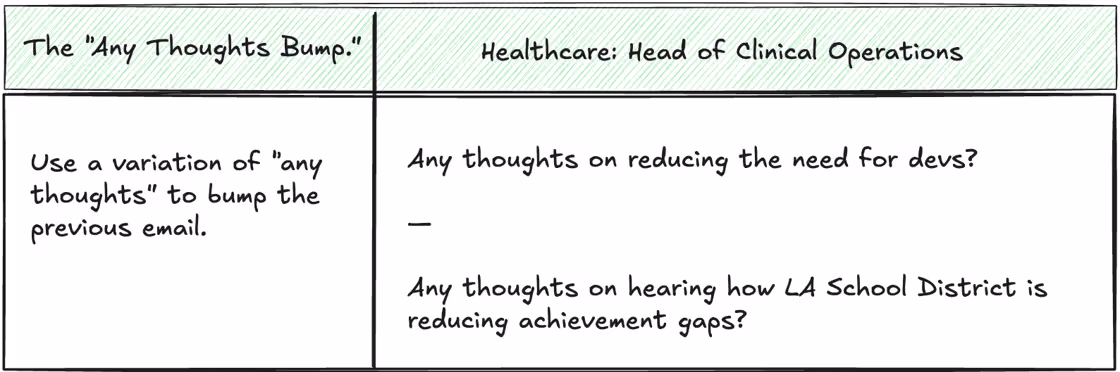 When writing a bump email, you have to keep it short. The longer your follow ups, the worse your reply rate. Limiting your bump emails to 1-2 sentences is how you double your reply rates.