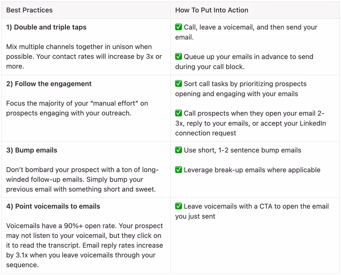It’s using the phone, through effective voicemails, as a “nudge” for the prospect to check their email. Lower-friction asks like this are way easier than playing phone tag with you.