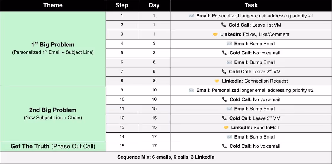 - Over 3 weeks: 6 calls + 6 emails + 3 social touches