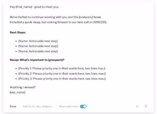 Everyone in sales has emails they need to use over and over again — meeting recaps, objection handles, and multithreading introductions. Spread the love and use this as an opportunity to test which emails receive the best response.